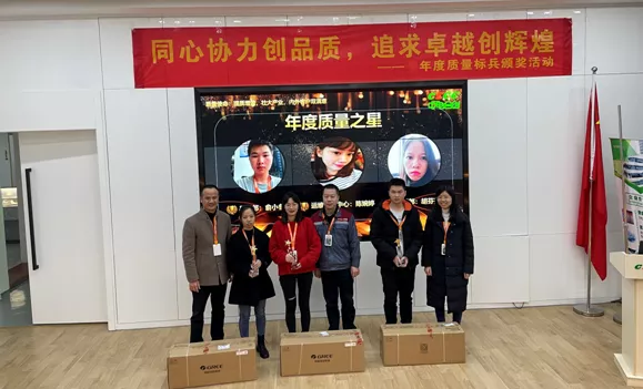 在活動表彰環(huán)節(jié),公司總裁林潮龍和管理者代表洪軍、陳賽榮向2021年度質(zhì)量之星頒發(fā)獎杯及獎品,以此表揚先進、樹立標桿,激勵大家再上新臺階。